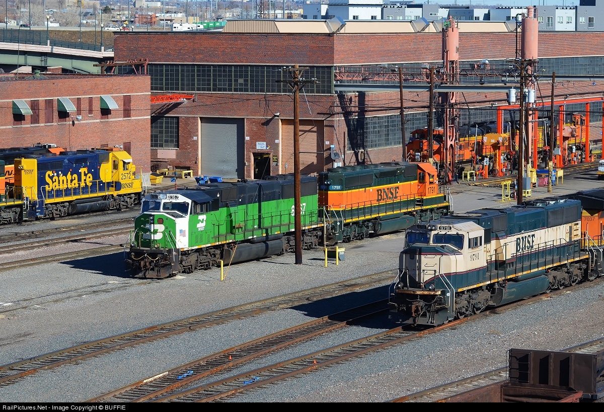Six of the BNSF color schemes and seven types of BNSF power are represented in this photo - BNSF 9791 (SD70MAC) in Grinstein Green (or Executive), BNSF 3167 (SD60M) in Cascade Green, BNSF 2572 (GP35) in the 'Yellowbonnet' scheme, BNSF 1791 (SD40-2) in the 'Heritage I', BNSF 7037 (ES44C4) and BNSF 9303 (SD70Ace hiding in the shadows at the refueling island) in the 'New Image' or 'Swoosh' Scheme, and for the eagle eyes, BNSF 5616 (AC4400CW behind the SD70Ace) in the 'Heritage II' scheme. Too bad there was not a Warbonnet present!