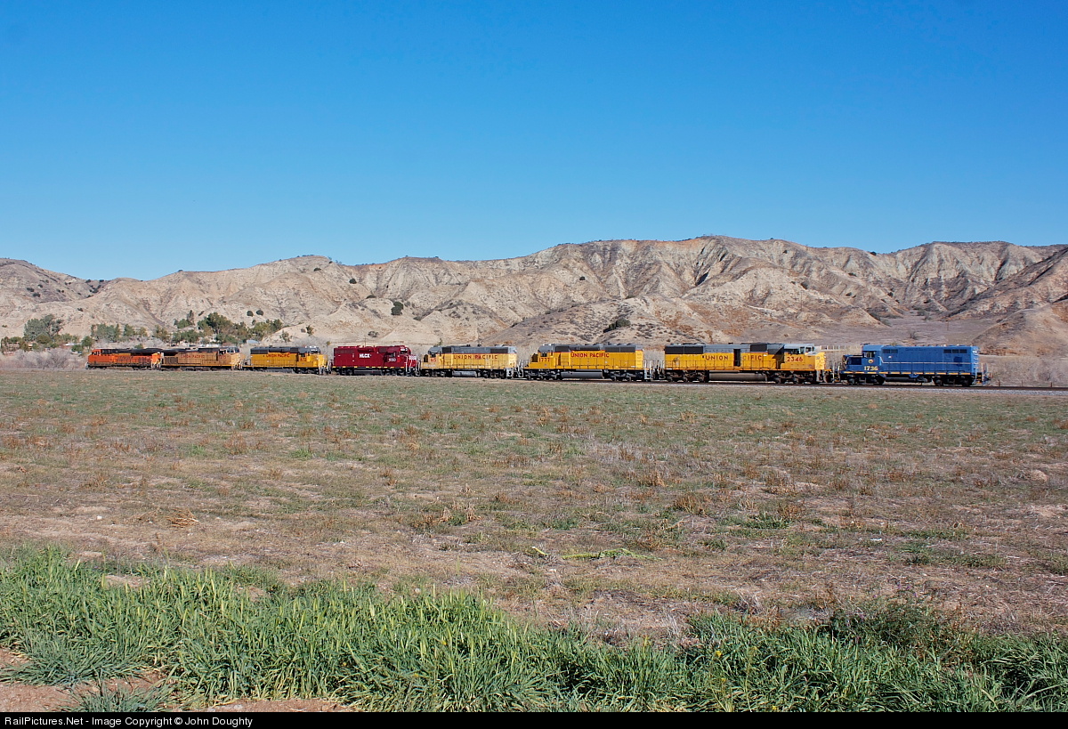 BNSF 7134 leads a mixed bag of 8 locomotives westbound down San Timoteo Canyon in Banning Pass. Consist is BNSF 7134, UP 7275, UP 1672, HLCX 1050, UP 615, UP 1777, UP 2346, and GP-16 1736 from the San Pedro & Southwestern.