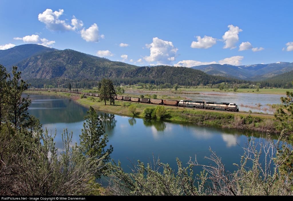 On May 21, 2011, a westbound BNSF coal train cruises along the Clark Fork just east of Plains, Montana, along Montana Rail Link’s scenic Fourth Subdivision. A matching pair of “Grinstein”-painted EMD SD70MACs, Nos. 9734 and 9767, lead the train.