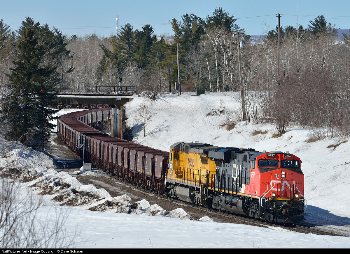 | The first seasonal ore train from U.S. Steel's Minntac plant to the Port of Escanaba (Michigan) rolls south across the St. Louis River with 200 light-loaded cars (CN 8102 was on the rear and the ex-UP GE was added at Pokegama for the trip south). The port of Escanaba can ship earlier in the season than ice-choked ports along Lake Superior and these pellets will be headed from there to the Gary Works. |