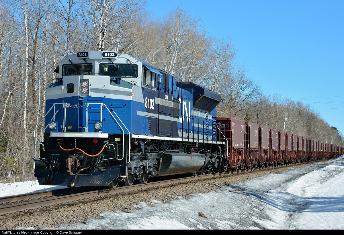 | A recently acquired EMD demo brings up the rear of a 200-car ore train as it heads for CN's dock facility at Escanaba, Michigan. The port of Escanaba can ship earlier in the season than ice-choked ports along Lake Superior and these pellets will be headed for Gary Works via lake vessel. |