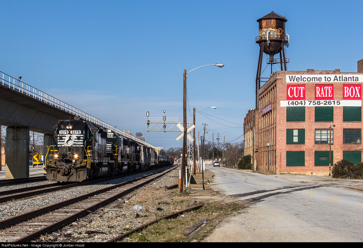 | NS P26 passes Oakland Junction on a beautiful spring afternoon with one of 25 SD40-2s (as of this post) retaining their original high short hood. The line splitting off towards the right is the belt line formerly belonging to the Atlanta & West Point. |