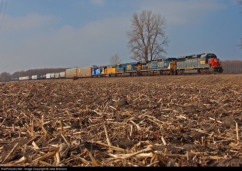Cornfield Color. It isn't common for Union Pacific to put a GP60 on the point of a manifest train, let alone one still wearing Saint Louis Southwestern colors. Someone in North Little Rock must have been a Cotton Belt fan, as manifest freight MNLASB 08 came north with former SSW 9691, now UP 1963, leading. The rest of the colorful consist was also interesting. Behind the two CSX GEs are a UP GP38-2 and a Railserve Leaf switcher. The latter started life with the C&O as an SW7. This train is sitting crewless at Steppig Road, where it will wait for at least 12 hours for a crew to take it north to the congested Alton & Southern's Gateway Yard, located 13 miles north. This was one of two northbounds waiting to get into the yard; the second, resting a few hundred feet from the rear of this train, was empty oil train ONUEU with NS 1069 leading.