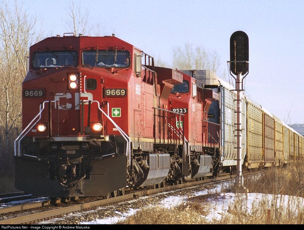 CP 9669 leading a train of autoracks comes into La Crosse. (Moving Snowshed)