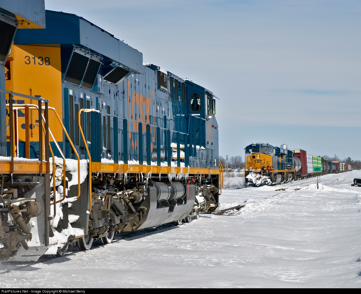 Boxcar ES44AH's meeting. At right is CN 327 (with CSXT 3105 and CSXT 867) which a Canadian crew has just brought to Huntingdon from Montreal. Soon they will take CN 326 (at left with a similar lashup - CSX 3138 & CSX 813) northwards towards Montreal. The American crew that brought CN 326 to Huntingdon will take 327 towards the U.S. Both the lead units feature CSX's new logo. For more train photos, click here.