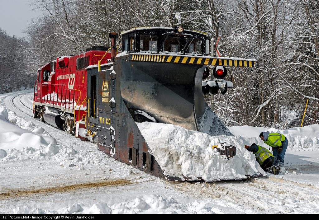 Following another nearly two feet of snowfall on much of the higher elevations of the Green Mountain Railroad's Bellows Falls Subdivision, VRS dispatched its 101-year-old ex-Canadian Pacific plow for the third time in 2014 to handle some snow moving. The March 13 run was full of frustration as several minor derailments were incurred by ice-filled grade crossings. The crew is busy using a rerailer under the plow to get the wheels of the front truck back on the rails so the plow can continue its eastbound journey to Bellows Falls.