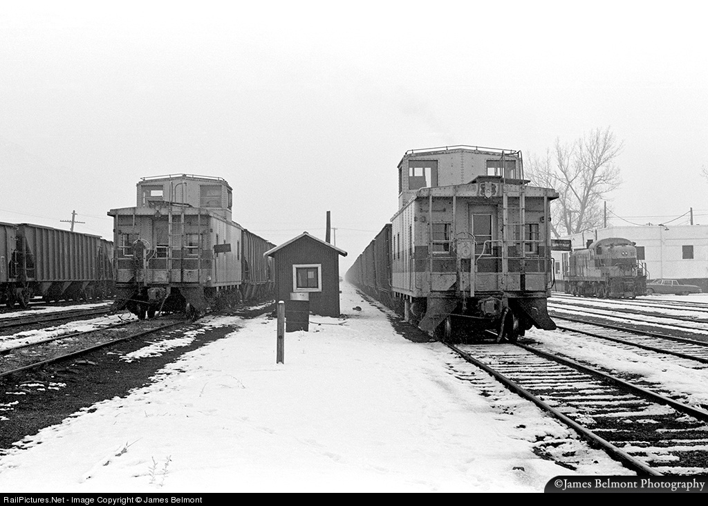 A pair of blue flagged Utah Railway cabooses meet at Provo Yard on Dec. 21, 1975. Alco RSD-4 No. 307, assigned to work the Provo Switcher, idles away near the office building.