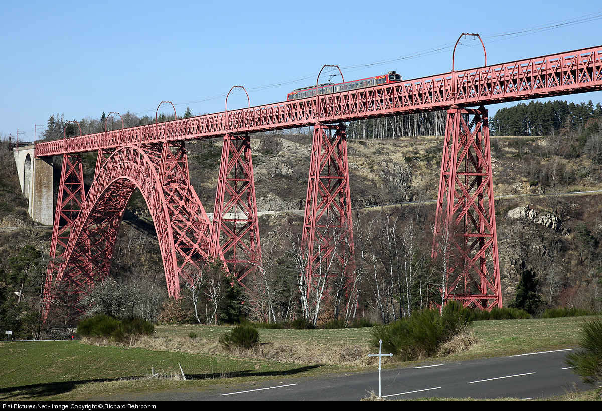 Only one passenger train daily is crossing the Viaduct of Garabit. Architect of the viaduct is Gustave Eiffel, total length 565m (1,854 ft), longest span 165 m (541 ft), 124 m (407 ft) high, construction 1882 – 1884.