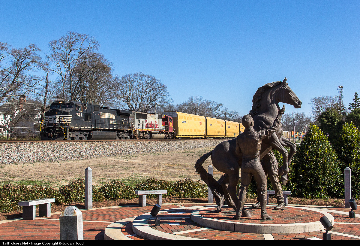 | Charleston to Atlanta intermodal 237 sprints down track two in Buford as they pass the iconic statue of Roy Rogers and Trigger at Tannery Row. A visiting BNSF SD75M in the classic Warbonnet livery trails second in the consist after being turned in Charleston. |