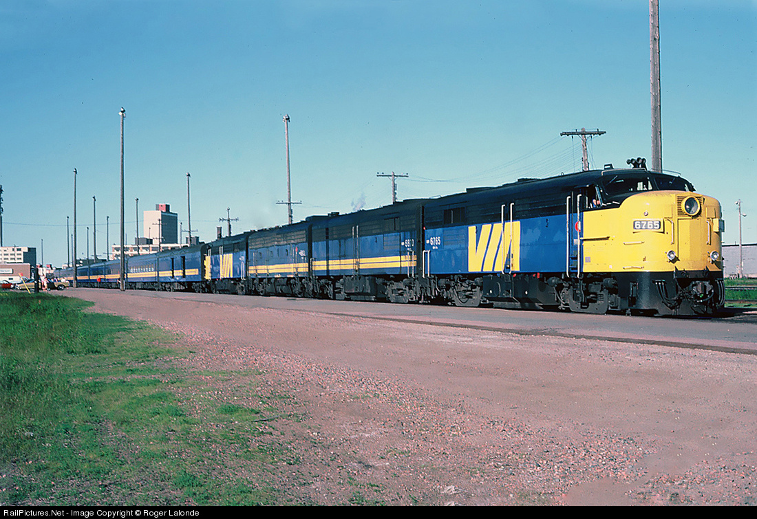 | Westbound train #15 the 'Ocean' with VIA Rail MLW FPA-4 #6765, MLW FPB-4 #6870, GMD F9B #6619, and MLW FPA-4 #6791 |