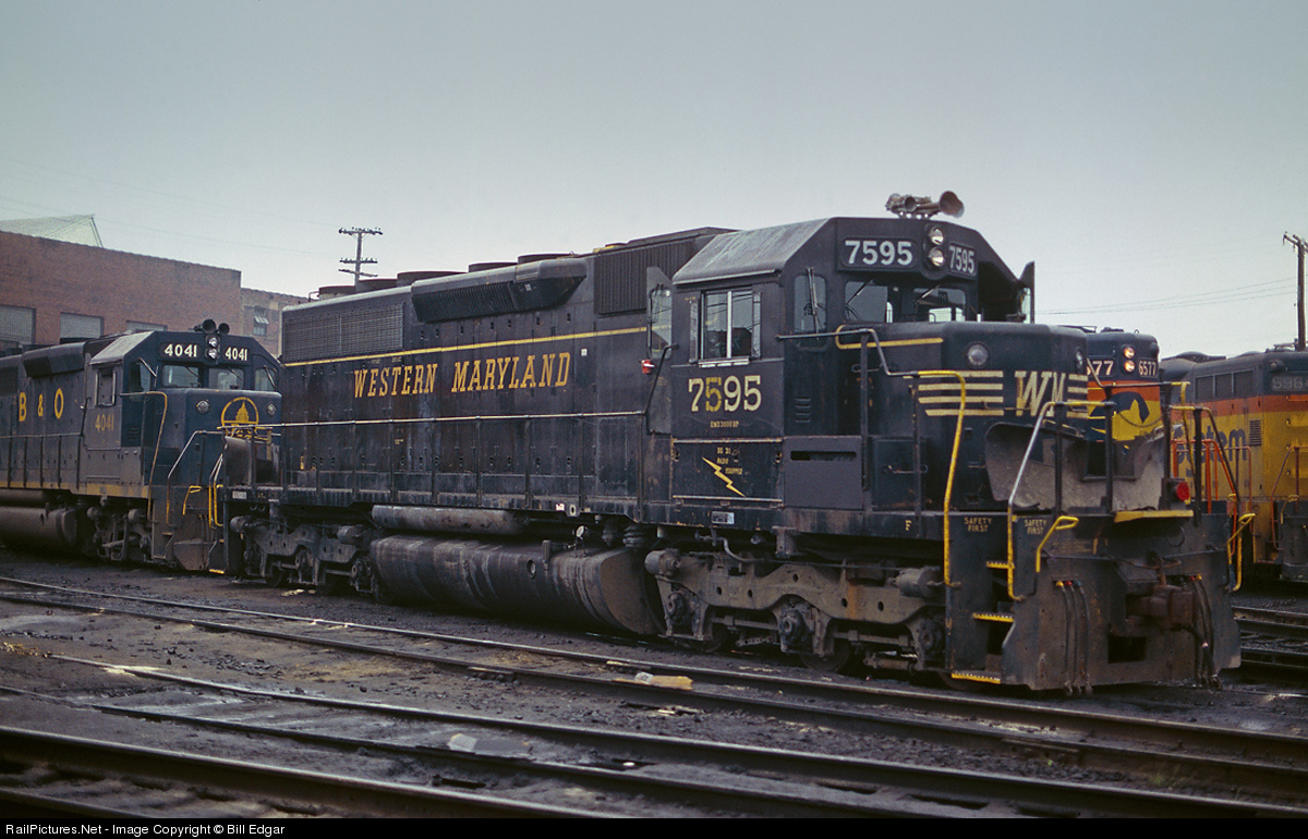 WM 7595 sits at Chessie System's Cumberland Shops along with BO 4041, a GP40. The unit is in need of work, and in the fall of 1981 the economy was such that it was likely to sit here for awhile. Meantime, a couple Chessie GP9s look on in the background, appearing more road worthy than their younger mate. By 1984 WM 7595 was wearing the yellow Chessie scheme.
