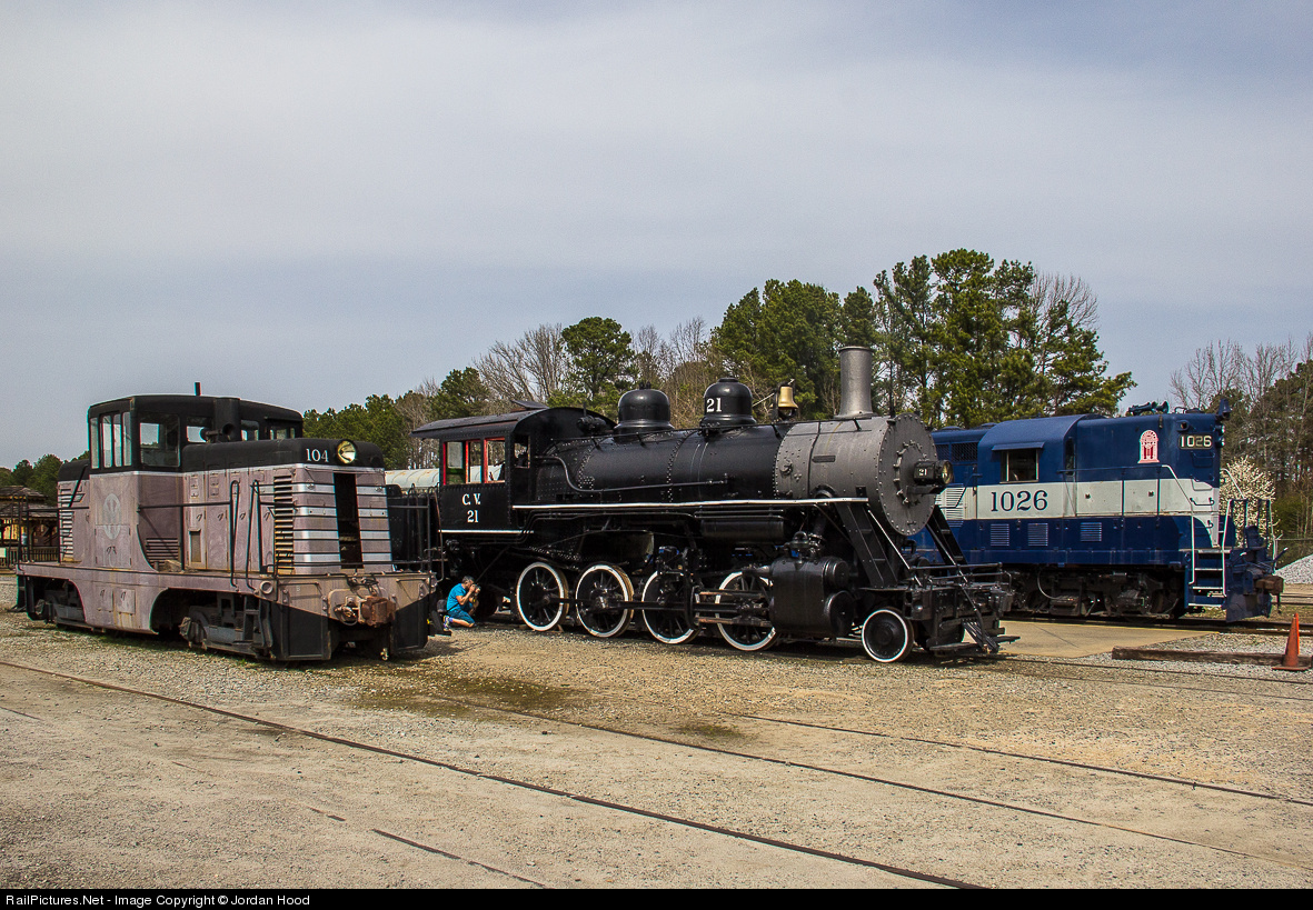 Three pieces of the Southeastern Railway Museum's collection rest in the pleasant afternoon sunshine. From left to right, there is NYO&W 44-ton switcher #104, Chattahoochee Valley 2-8-0 #21, and Georgia Railroad GP7 #1026 serving as power on the museum's short train ride.