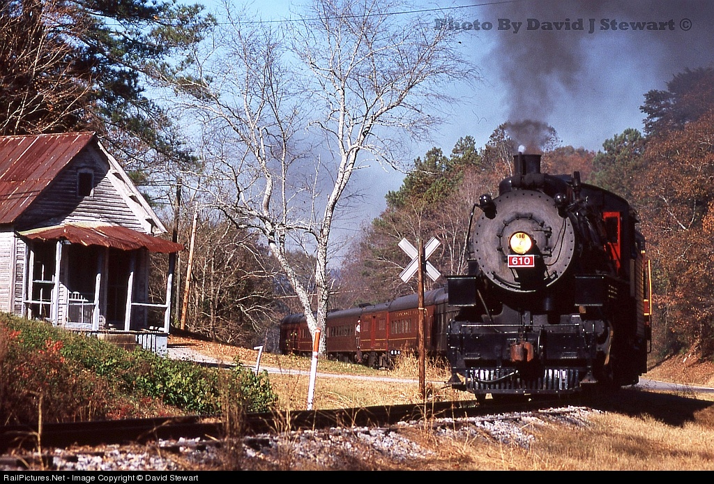 | Tennessee Valley Railroad Museum's 2-8-0 No.610, ex US Army steams towards Summerville as it passes through the most photographed location on the C&C with another Fall Foliage Excursion on a fine October day in 2005. |