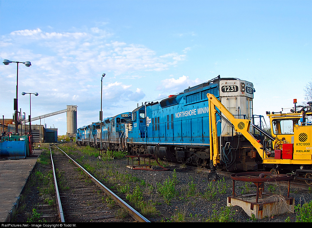 New and Old. Some much newer track M.O.W. equipment is parked behind a quartet of old SD18's (1231, 1230, 1227 and 1232) sitting on one of the yard tracks at North Shore Mining's mine yard at Babbitt, MN. These are ex- Reserve Mining and now are retired and used for parts.
