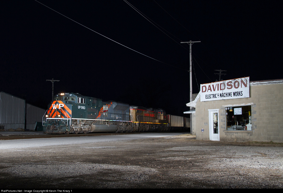 | After waiting on CSX cross traffic at Sullivan, UP 1983 gets rolling again after sunset with its empty coal train for Newton, IL on the INRD. |