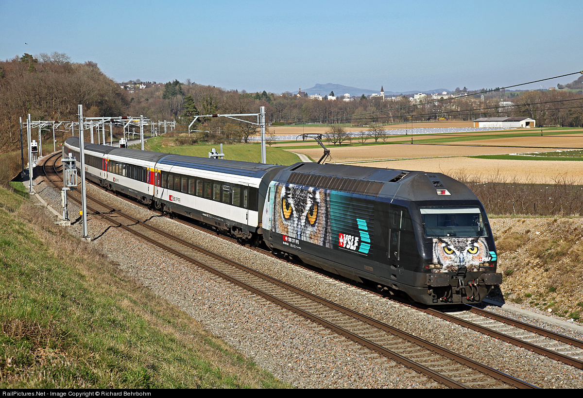 | "The Owl" Re 460 105 with publicity paint scheme for VSLF (Association of swiss locomotive drivers) is pulling Interrregio 2577 Schaffhausen - Zürich. |
