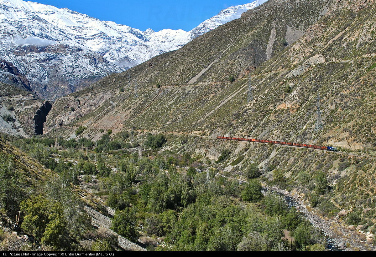 By the old trasandine railway line Los Andes - Mendoza, the "Andina" loaded down with pots of copper concentrate from Saladillo - Rio Blanco, passes (through 3 tunnels and 2 bridges) the spectacular "Salto del Soldado," (soldier jump, in background) geological formation of the erosion caused by the Aconcagua River, much rocky gorge about 100 meters. As data annex, the term "Salto del Soldado" (soldier jump) legend is due to the timing of the Reconquest in which a lone soldier escaped Chilean military forces of the Spanish royalty, heroically jumped this gap, can escape those who pursued. It is estimated that the time gap throat was 3 meters, but not now that is 10 meters wide, making it impossible for a new leap.