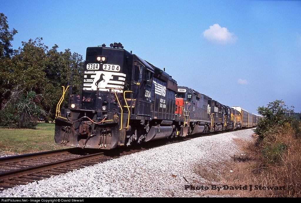 | With it's all EMD consist, NS train 347 charges through Locust Grove, Georgia with the NS 3304 leading loud & proud. NS 3304 is noted as being a Locotrol master unit in it's heyday, the firecracker antennas can still be seen in these views of the 3304 although this technology had long been abolished by this date. |