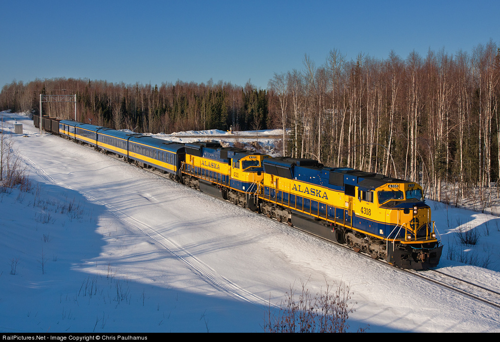 ARR 4318 leads the Aurora Winter Train just south of Willow, AK on its way back home to Anchorage on a gorgeous Wednesday afternoon. The Aurora Winter Train typically runs once a week, heading north to Fairbanks on Saturday and back south to Anchorage on Sunday. This year the Alaska Railroad decided to run two mid-March, mid-week trains to entice the spring break crowd to ride the train and to give other folks options for shorter get-aways here in The Great Land. The ridership looked pretty strong from what I could see as the train breezed by me after getting my shots.