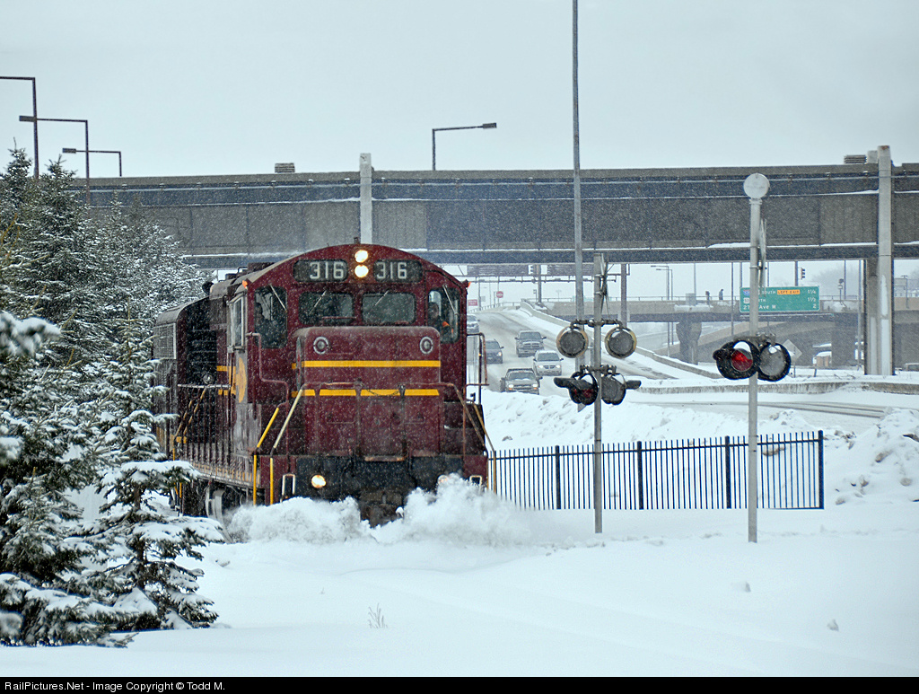 With light snow still falling, DMIR 316 and crew break trail as they head out of town along Interstate 35 near downtown Duluth, MN. The crew was on duty on this day to retrieve a cut of coal cars that were in winter storage and return them to BNSF for service.