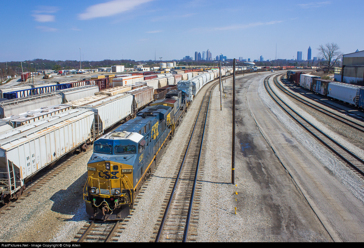 A northbound CSX manifest comes into a busy Tilford Yard on a warm March afternoon. The Midtown and Downtown skylines of Atlanta are visible in the background, and are as much a reflection of commerce as the rail yard is. Some of the companies which use the visible buildings are AT&T, Bank of America, CNN, Norfolk Southern, and Georgia Pacific, among others.