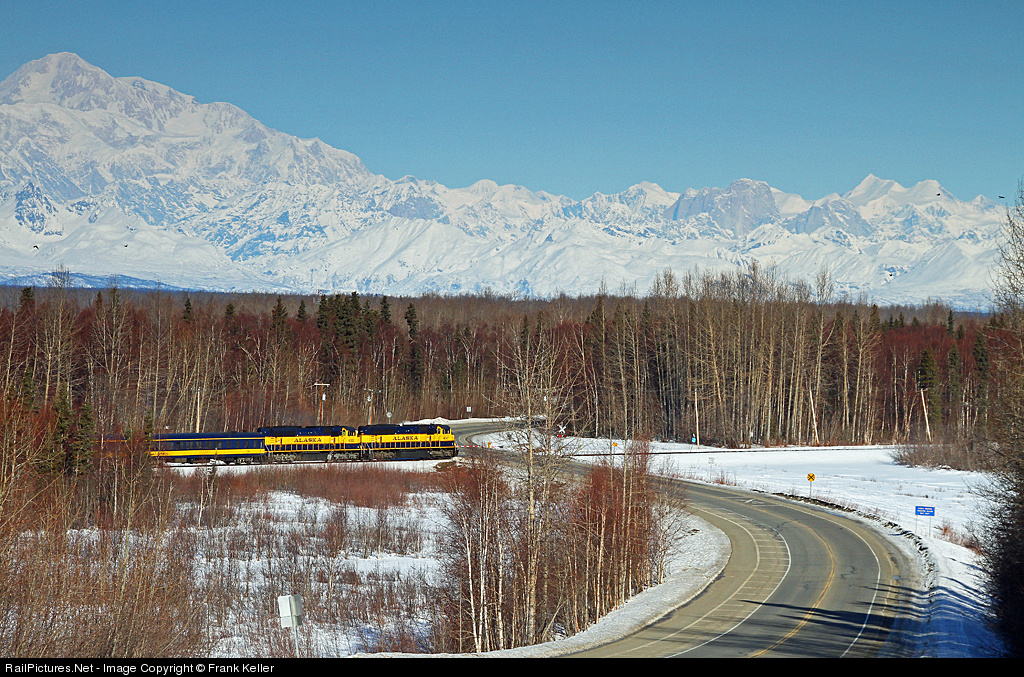 | The northbound Winter Aurora passenger train arrives in Talkeetna under the watchful eye of Mt. McKinley, known almost universally in Alaska as Denali, and the Alaska Range. It was a beautiful day in Alaska. As often happens to photographers of the Alaska Railroad it is feast or famine. This Saturday had two northbound passenger runs out of Anchorage as well as two southbound freight runs out of Anchorage for Seward. |