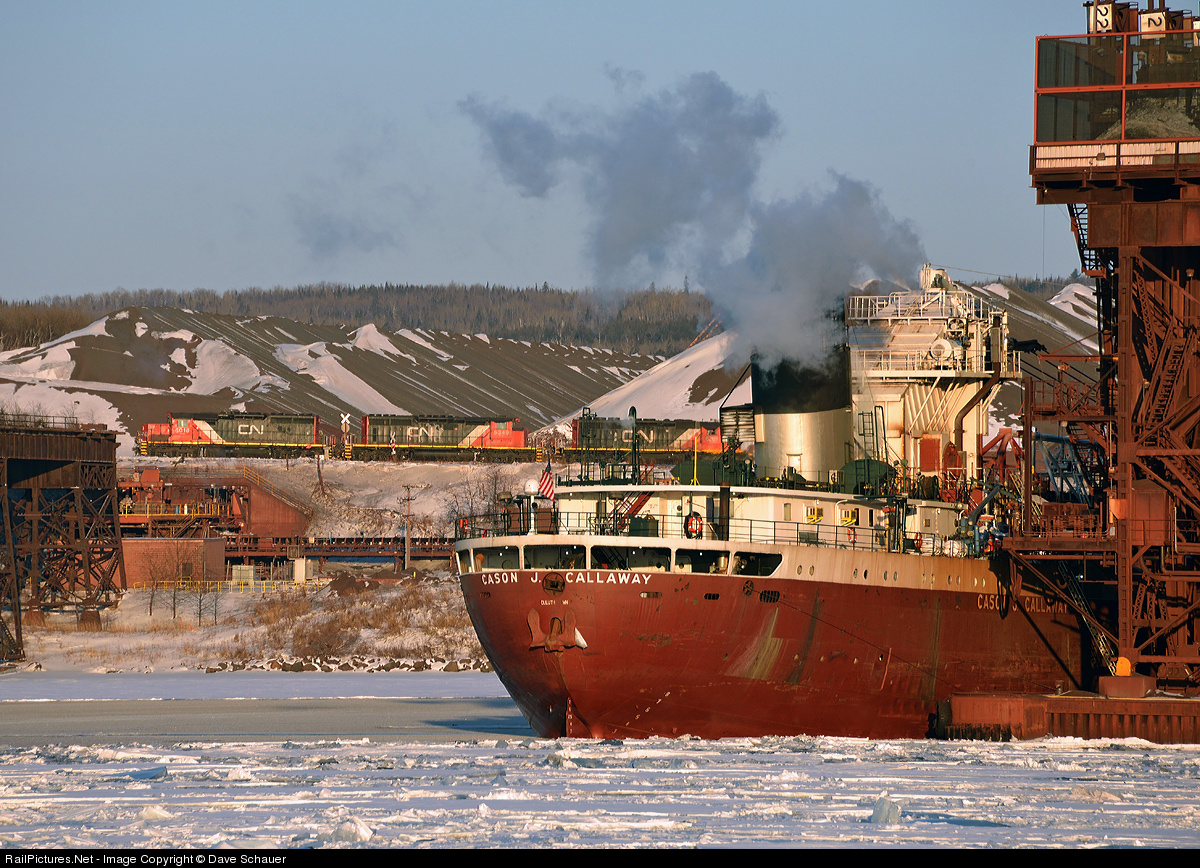 | A trio of light units roll past the first ship of the season, the Cason J. Callaway (also owned by CN). The piles of ore are high and ice will likely hamper the start of this shipping season. |