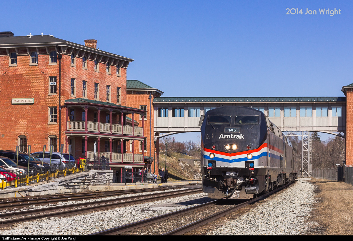 | The Capitol Limited makes its station stop in Martinsburg, WV. Leading is AMTK 145, the Phase III heritage engine. The former station is now used for offices leased out from the town who owns the building. It was replaced in the 1990's by a more modern structure to its left. It was once the B&O hotel and not only served as the town's railroad station but also crew quarters for the company. |
