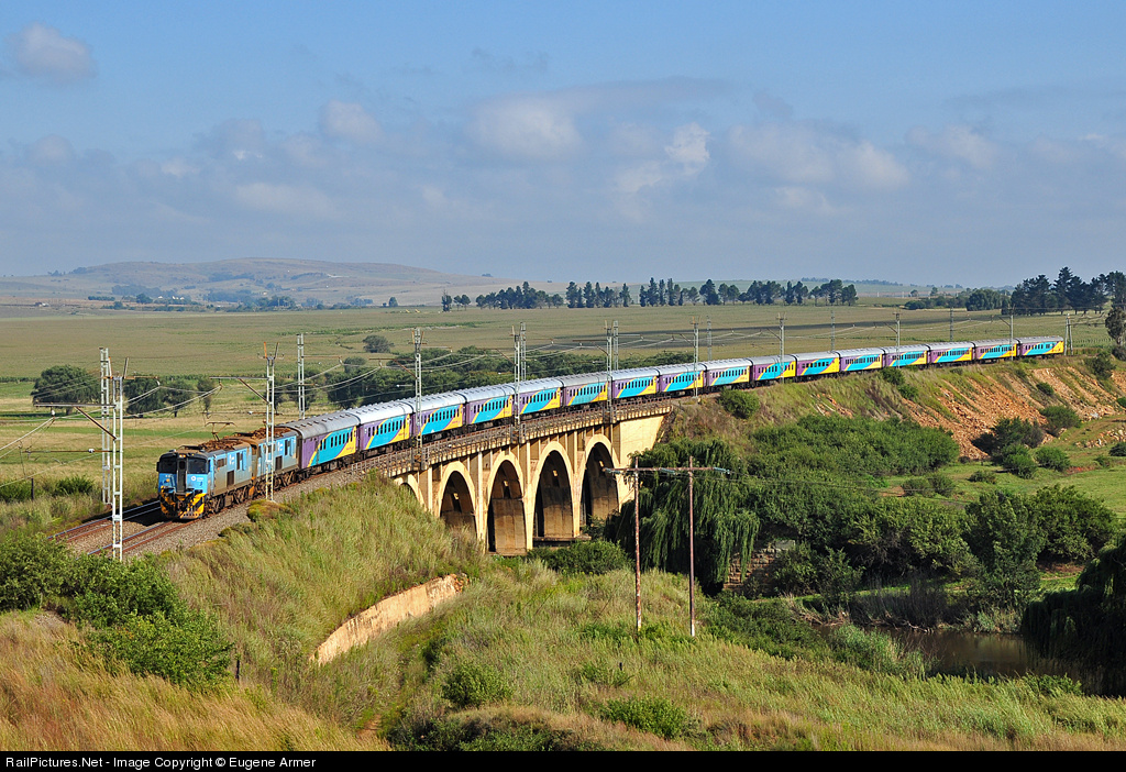 Passenger operator PRASA (Passenger Rail Agency of South Africa) operates long distance services under the "Shosholoza Meyl" brand (Shosholoza Meyl = a pleasant journey). The agency has decided to withdraw it's once weekly "Daylight" service between Johannesburg and Durban, as from 1st April 2014. Here the second to last "Daylight" is crossing the Suikerbosrant (sugar bush ridge) river, between Spruytsrus and Fortuna, behind a pair of 18E's wearing the light blue PRASA livery. At this point the river forms the provincial boundary between Gauteng and Mpumalanga - the locomotives have crossed into Mpumalanga, while the rest of the train is still in Gauteng. The retaining wall below the locomotives is part of the old track alignment, with a bridge abutment visible across the river, to the right of the power pylon.