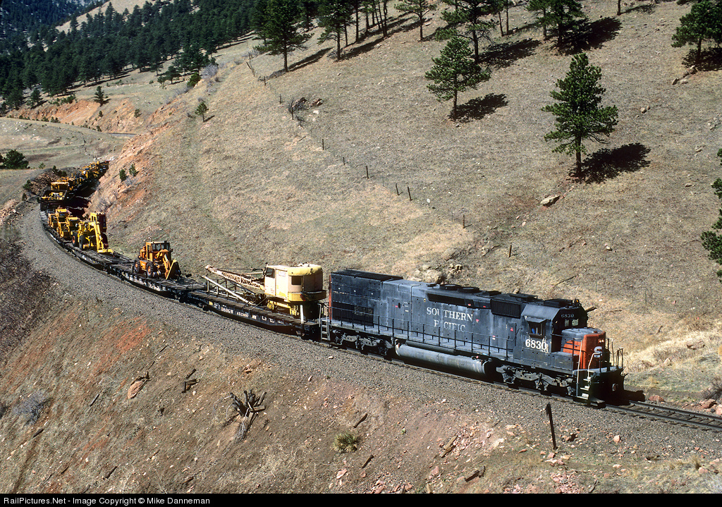 Southern Pacific EMD SD45T-2R No. 6830 leads a short work train into Tunnel 1 just east of Plainview, Colorado, on March 21, 1997. Much of the train is made up of Rio Grande flatcars loaded with maintenance-of-way equipment.