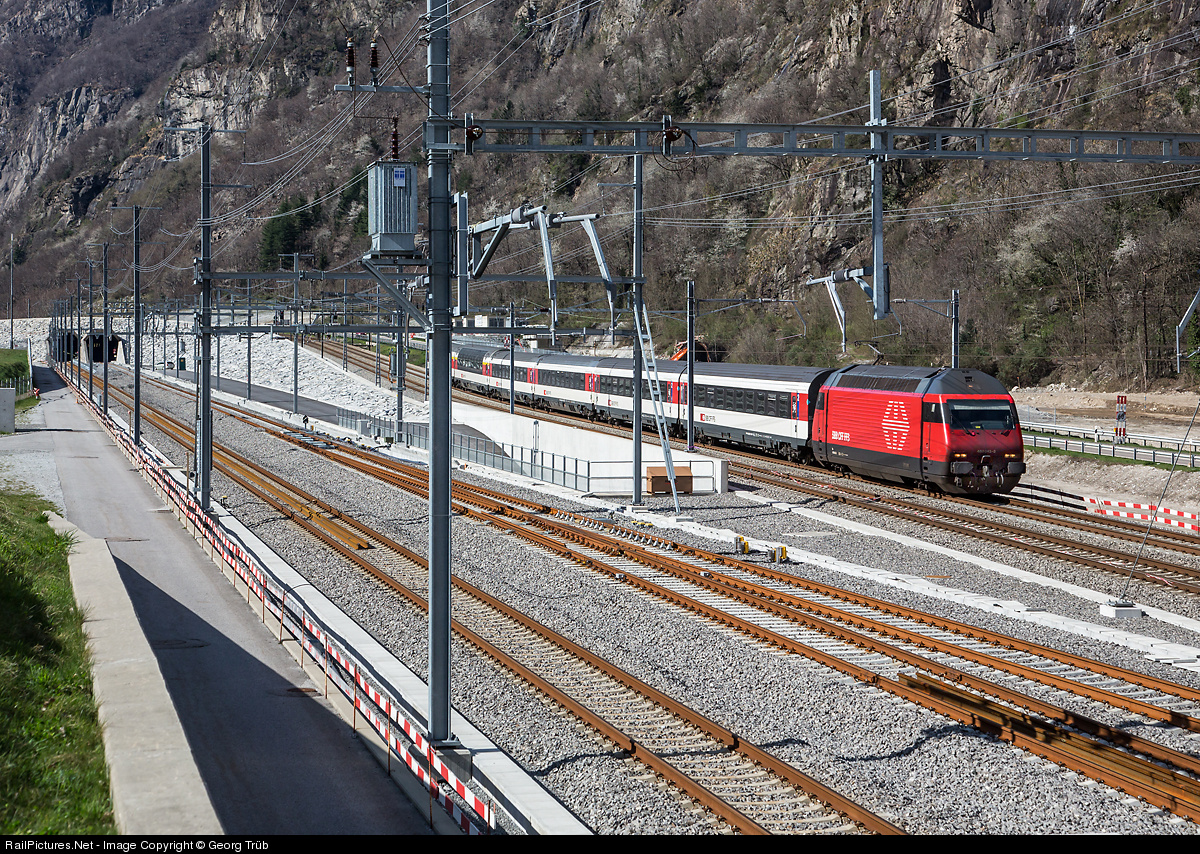 | Interregio 2271 "Wilhelm Tell Express" from Zürich to Locarno including a panorama car is coming down from the Gotthard mountain line and passing the portal of the new Gotthard base tunnel (two single bores) near Bodio/Pollegio. The 57 kilometer long (world record) Gotthard base tunnel (GBT) will open for regular traffic in december 2016, with first trains through from summer 2016. The highspeed switch in the foreground will allow the freight trains from the GBT to go onto the "old" line and run via Biasca, to let by the two times faster passenger express trains on the new line. |