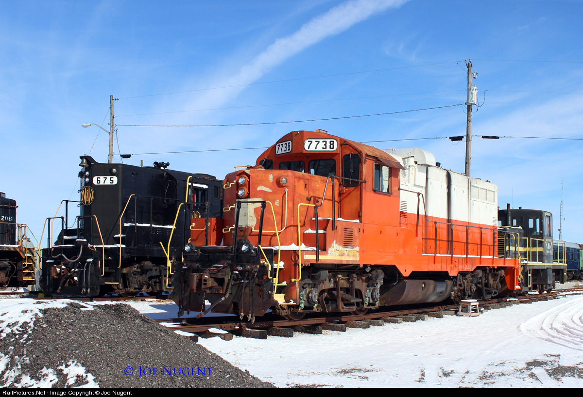 | Three of the museum's four operating locomotives are visible in this photo. Former ICG 7738 is about halfway through a repaint into her ICG scheme she wore when she emerged from the ICG's Paducah, KY shops. Originally a GP-7 she had her nose chopped and had a few other changes upgrading her to a GP-8. With no indoor facilities currently at the museum she'll be waiting for weather that doesn't include snow before her repainting is finished. Behind her is a GE 45 tonner and hiding stage left is former N&W 675 GP-9. |