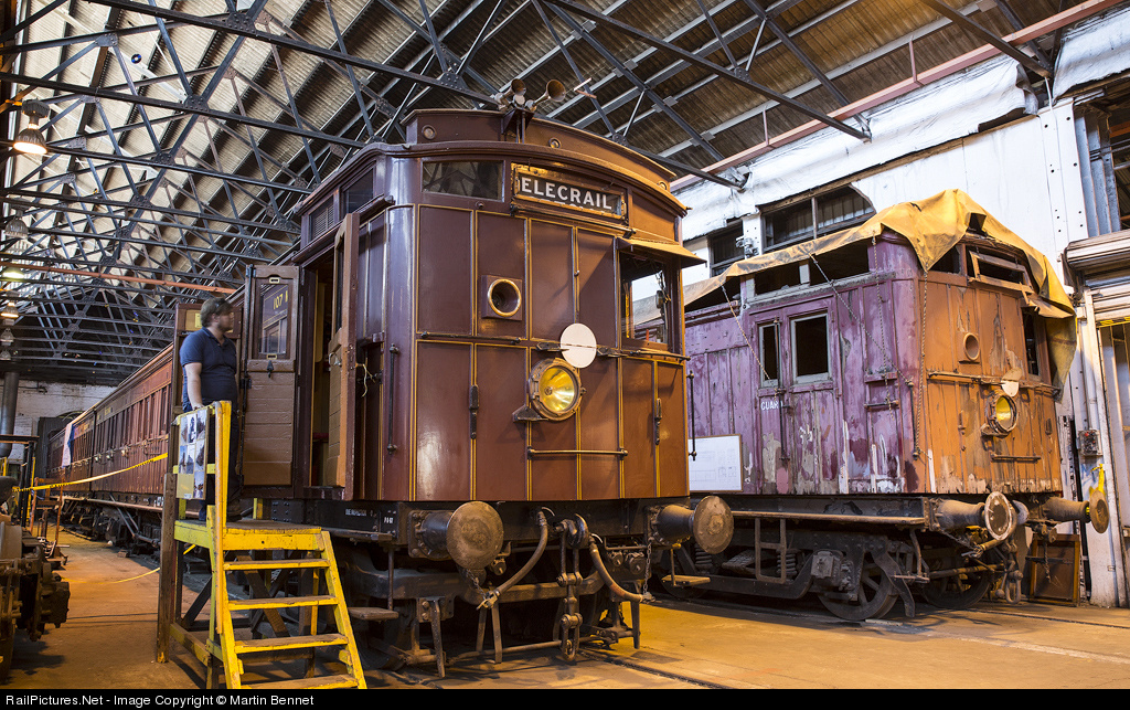 Elecrail's operational Swingdoor/Dogbox set made up of 107M and 137M rests inside the Newport Workshops, alongside unrestored driving trailer 24D. 107M was built as a steam hauled suburban car in 1888, and modified for electric use in the early 20th century. All three of these cars (along with another D car, 32D) made up the consist of the last Dogbox train to operate in revenue service, in 1974. Due to on-going accreditation issues these classic EMU's have not been able to run on the mainline since 2004, but it is hoped that this will be resolved in the next couple of years. [UPDATE:] The cars in this image were tragically completely destroyed by fire in 2015. See photo No. 521628 for more information.