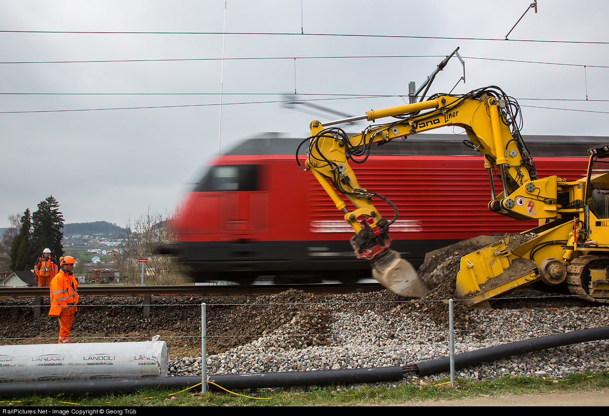 Large track renewal between Sirnach and Eschlikon during operation on the adjacent track. "Vanoliner" ballast excavater is passed by an Intercity with locomotiv Re 460.