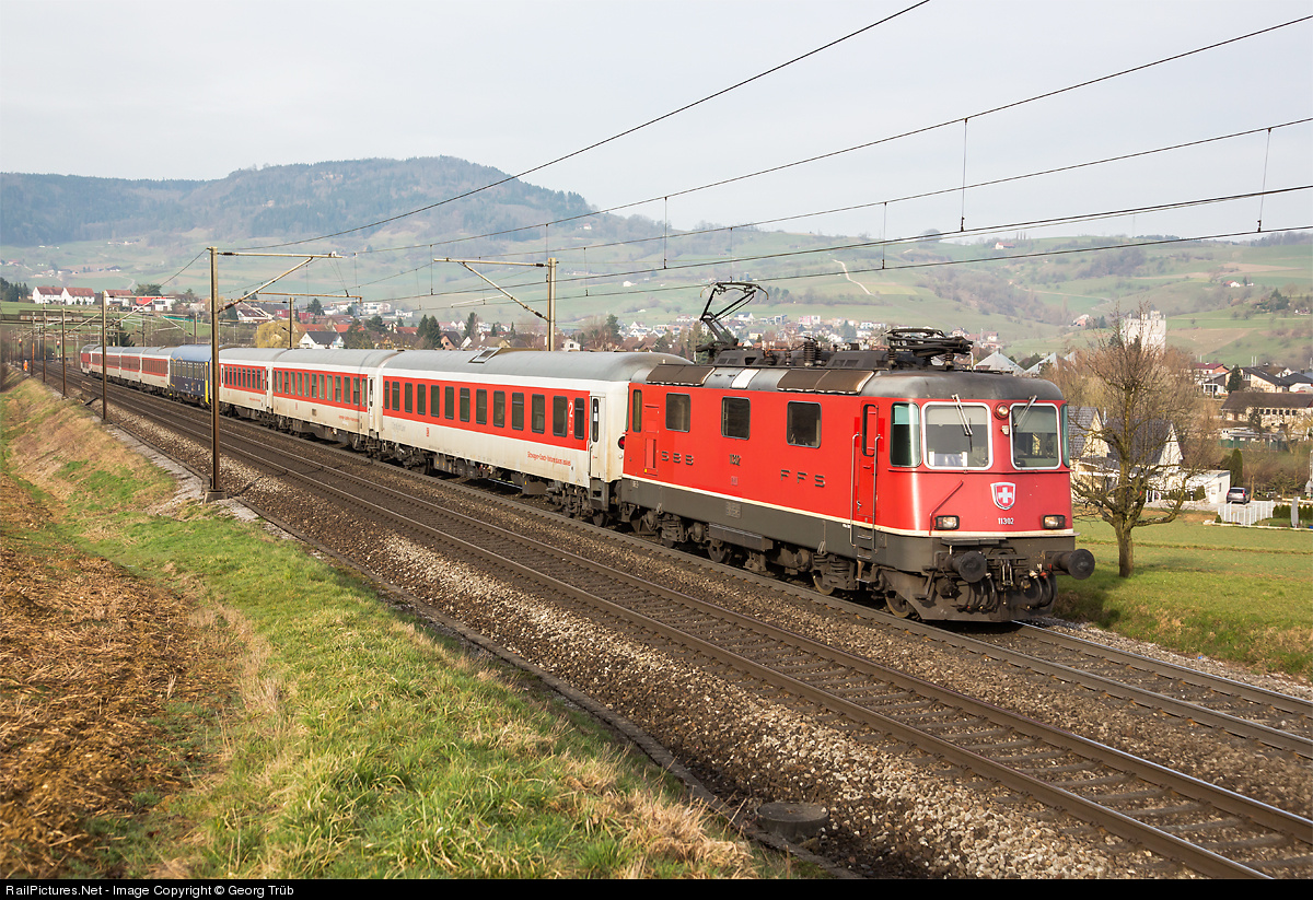Overnight train 458 "Canopus" of CityNightLine from Prague and Berlin (train name "Sirius") to Zürich, pulled by locomotive Re 4/4 II 11302, on the Bözberg line near Frick. The train has sleeping, couchette and seat cars. The dark blue car is the sleeper of the Czech Railways running from Prague via Dresden, Leipzig, Frankfurt, Basel to Zürich.