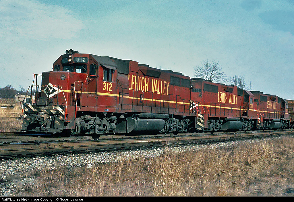| Three Lehigh Valley EMD GP38AC #312, #311 and #313. No photographer listed on slide, from my collection. |