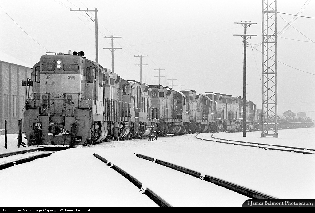 During the 1960s and 70s, it seemed the reporting mark 'UP' meant 'UnPredictable'. The morning PVSC (Provo-Salt Lake City) freight is blue flagged, awaiting departure from Provo Yard on January 24, 1976. Leading the train of Geneva Steel coil is a pair of GP9s, a GP9B, a GP20, a GP9, a DD35B, and an SD40. A TR5 'cow and calf' pair are grazing in the background near the PVSC's caboose. Can you dig it?