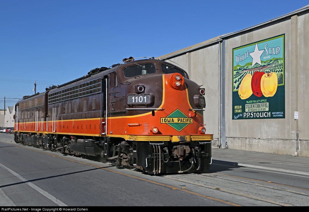 A pair of F9’s in freight service is a rare sight these days. SC 1101 and SC 1102 head down Walker Street in Watsonville on their way to the interchange at the UP yard to pick up two centerbeam cars loaded with lumber for Big Creek Lumber and two tank cars loaded with tallow for the North Star Biofuel plant.