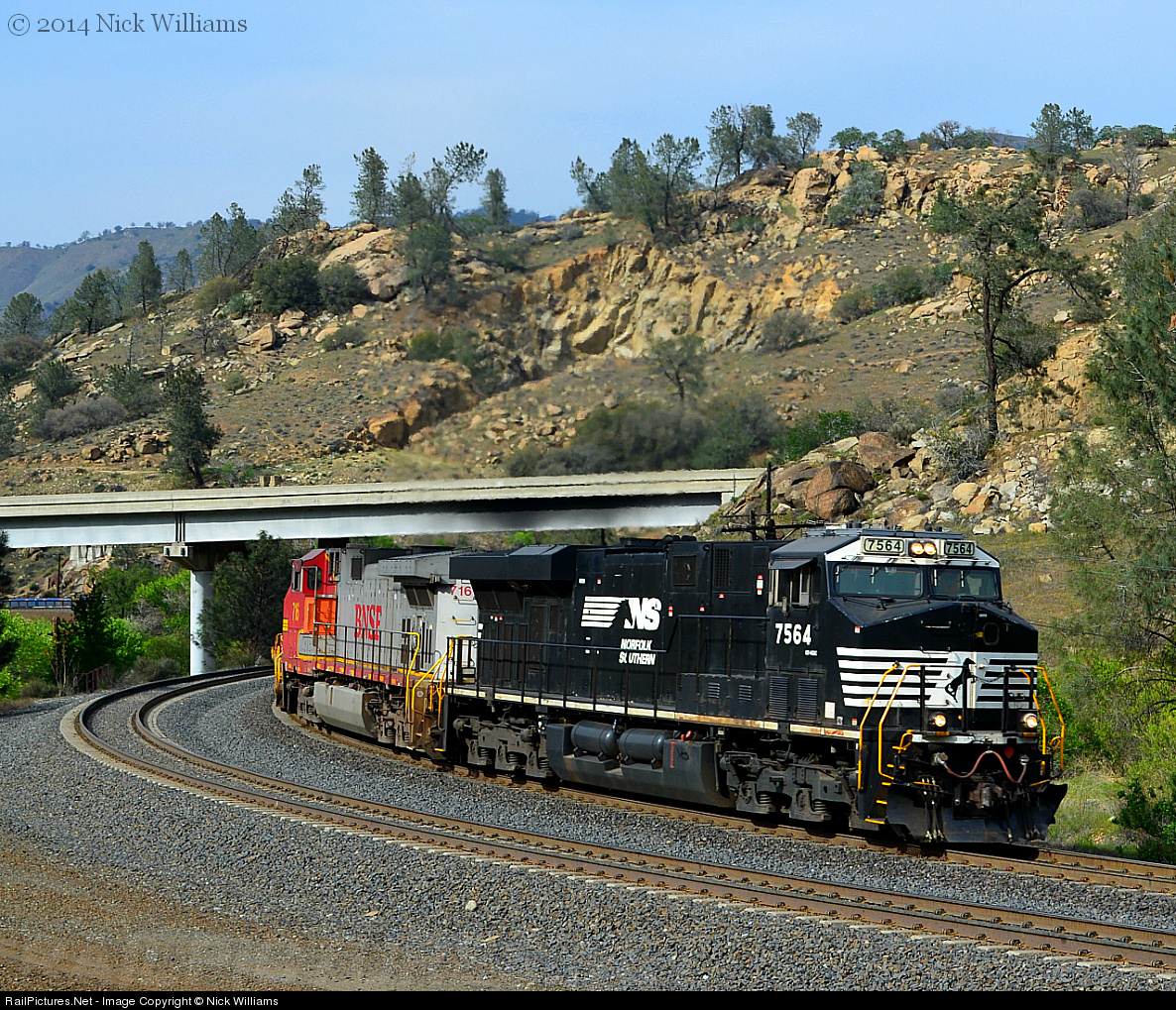 | NS 7564 leads a BNSF Warbonnet and a string of baretables as it navigates the S-curves at Woodford siding. Foreign power is becoming quite coming nowadays on the Tehachapi Pass, leading nonetheless. |