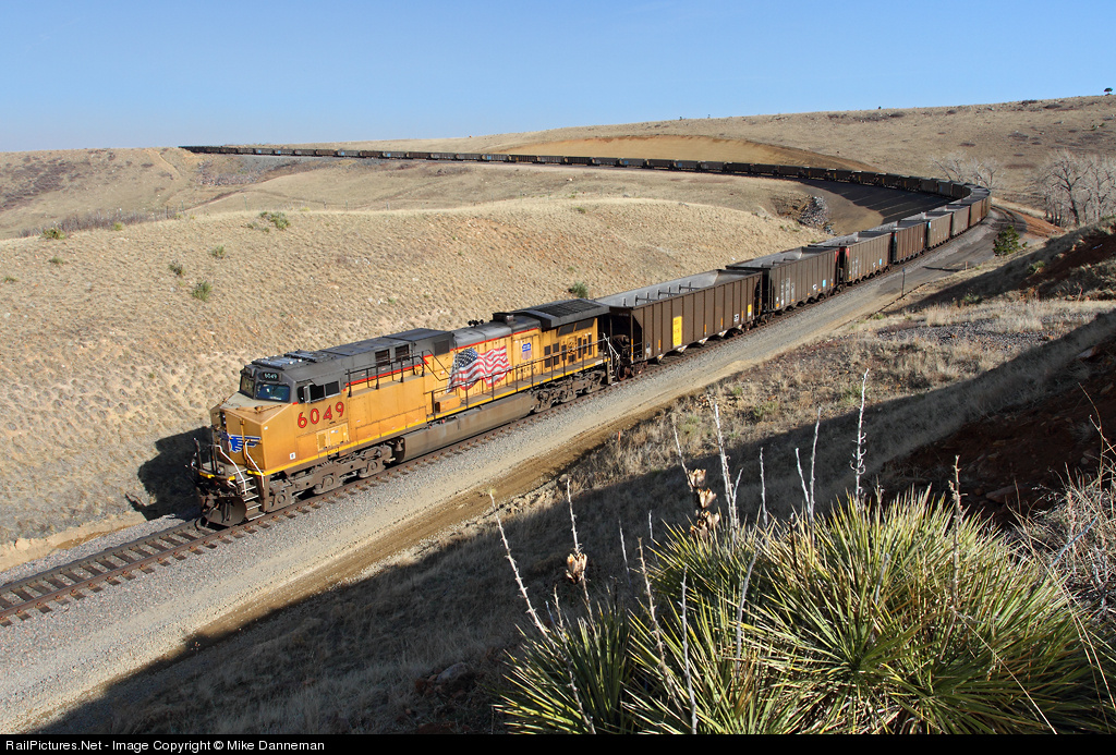 | Union Pacific GE AC4400CW-CTE No. 6049 operating as a DPU, pushes a westbound coal train into Big 10 Curve west of Rocky, Colorado, on March 25, 2014. |
