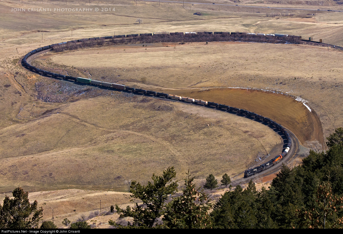 Foreign Power leading trains on Moffat is extremely rare. Here, two NS units lead a BNSF Dash 9 on BNSF's Provo, UT to Denver, CO manifest around the Big Ten Curve west of Denver.