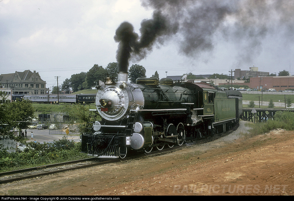 | Southern 4501 highballs Columbia for the NRHS Convention in Charleston. The old Union Station, now a restaurant, is seen in the distance. The wye tracks the train is riding over have been pulled up, a building sits on this spot now. |