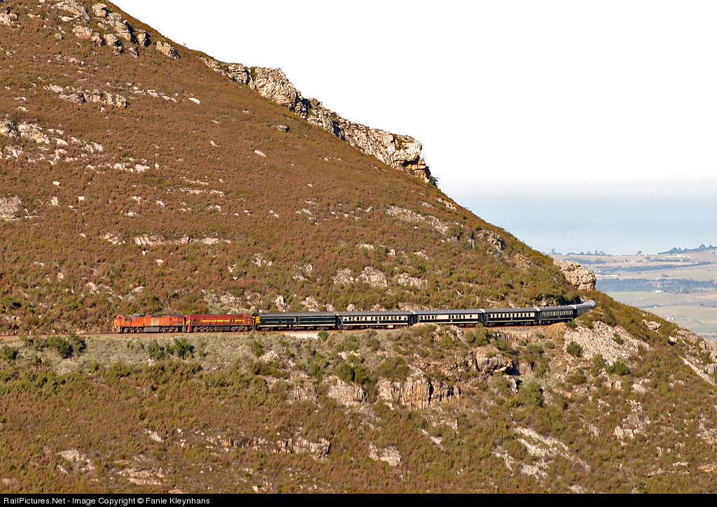 High up in the Outeniqua mountains 2 class 34s pull a Rovos train towards the submit from George to Oudtshoorn. George is just behind the mountain and in the far distance the Indian ocean.