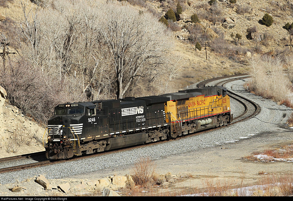 | Norfolk Southern to the rescue; in Utah! Union Pacific's daily manifest train, the MRONY, on the Provo Sub. stalled on the 2% grade between Gilluly and Soldier Summit not far west of the summit of the grade. I heard on the radio the DS and train crew talking about motive power problems. A set of helper power was called at Helper yard at the eastern foot of the grade and set out for Summit to help the stalled MRONY over the top. It is pictured here exiting the horseshoe curve between Lynn and Kyune. |
