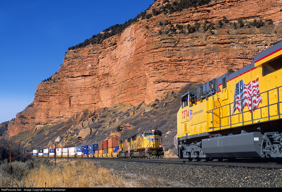 An eastbound Union Pacific stack train with EMD SD70M No. 3912 on the lead meets a westbound powered by brand-new GE ES44AC No. 7374 in Echo Canyon east of Echo, Utah, on March 19, 2009.