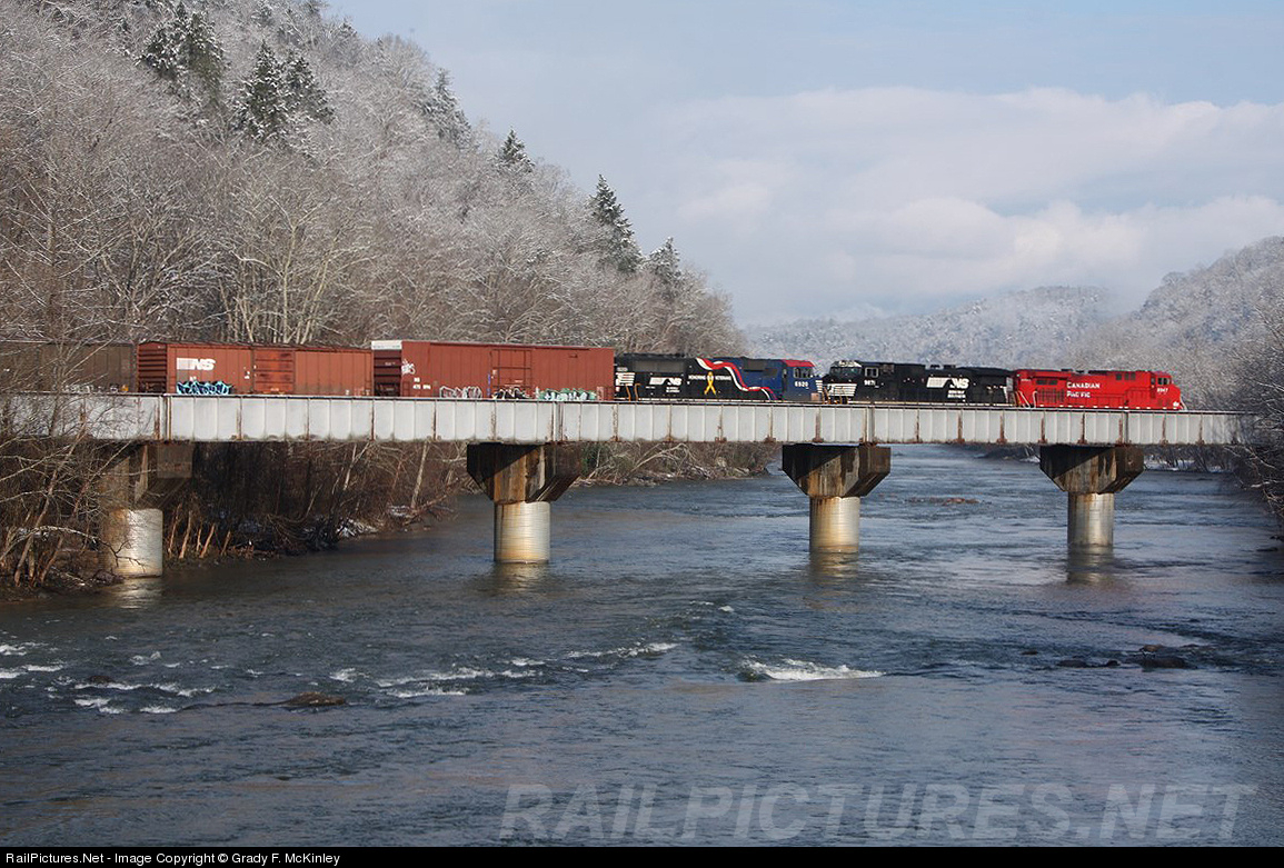An early morning spring snowfall has given way to clear skies as CP #9547 leads a mixed bag of power, including NS #6920 across the French Broad River near Marshall, NC.