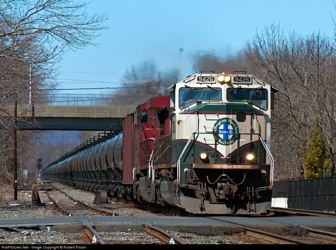 | The crude oil boom has provided railfans in New Jersey with a chance to see locomotives from every class 1 railroad in North America. This empty crude oil train is returning westbound (running eastbound here) with a colorful BNSF/CP consist. The lead unit once was once primarily assigned to Powder River coal trains but is now found hauling a different kind of unit train. |