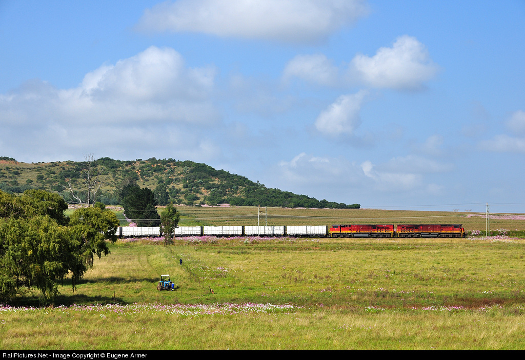 Transnet Freight Rail are currently using pairs of class 43 diesels to haul 50 wagon trains of coal in open containers from Arbor siding (between Delmas and Ogies) to Eskom's Majuba power station, near Volksrust. At least two trains a day have been observed on this service. One of these empty workings is seen on the Natal main line between Greylingstad and Balfour, returning to Arbor. Patches of the pink and white Cosmos flowers that bloom at this time of year on the highveld, add to this rural scene.