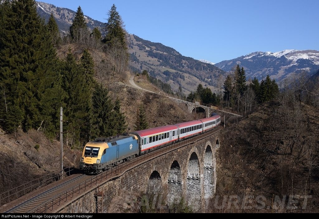 | Intercity 592 crosses Hundsdorfer Viaduct on the Tauernbahn on its way from Salzburg to Klagenfurt. Far away from home rails the Hungarian class 470 locomotive pays back axle kilometers to the Austrian ÖBB which operates a fleet of 282 almost identical locomotives as their class 1116. In contrast MAV owns only ten 470s. |