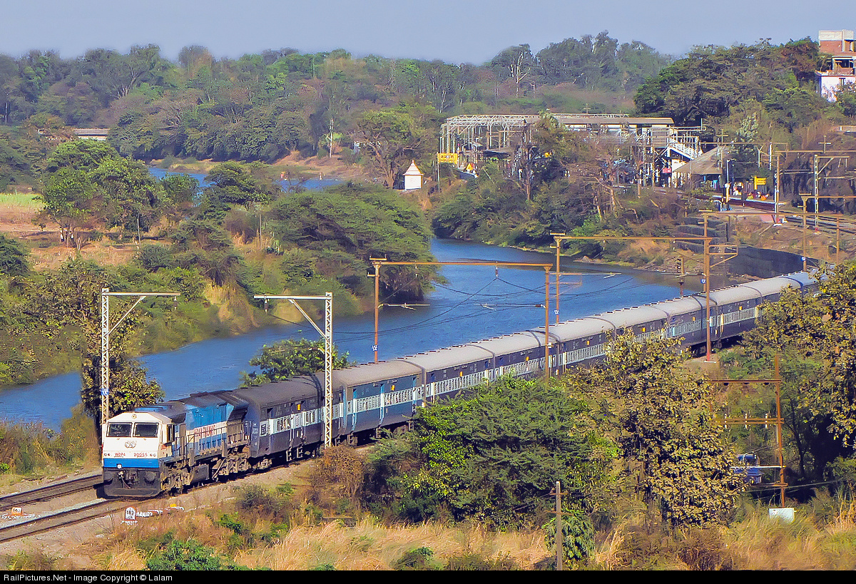 With just 144 out 1153 kilometers journey left, this WDP-4 locomotive has brought 23 passenger coaches load, all the way from Bangalore in Southern India. Gliding through the greenery along the sides of river Indrayani, here is Udyan express skipping a small station, Kamshet.